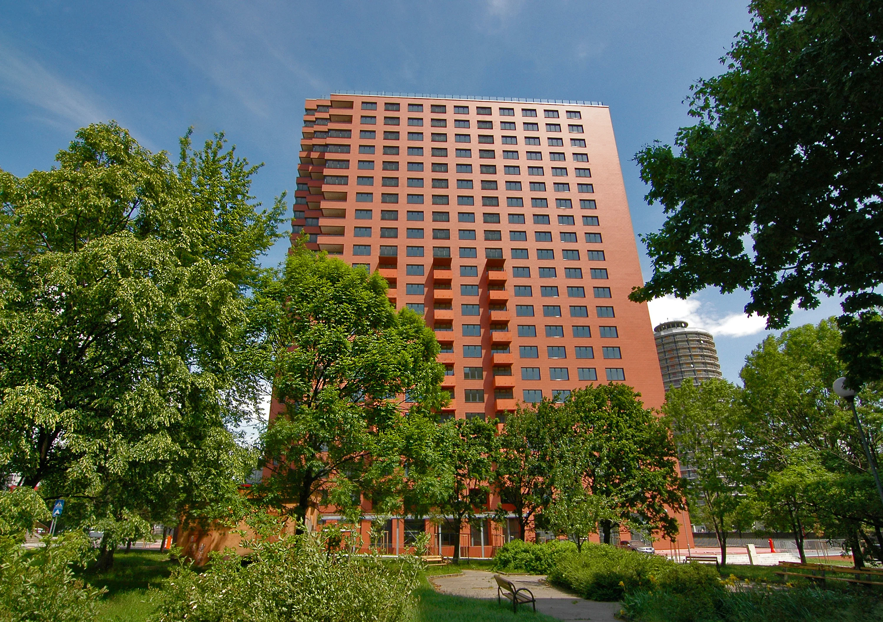 Die einzigartige Architektur und die Terrakotta Fassade machen den Wohnturm zu einer modernen Ikone der slowakischen Hauptstadt.