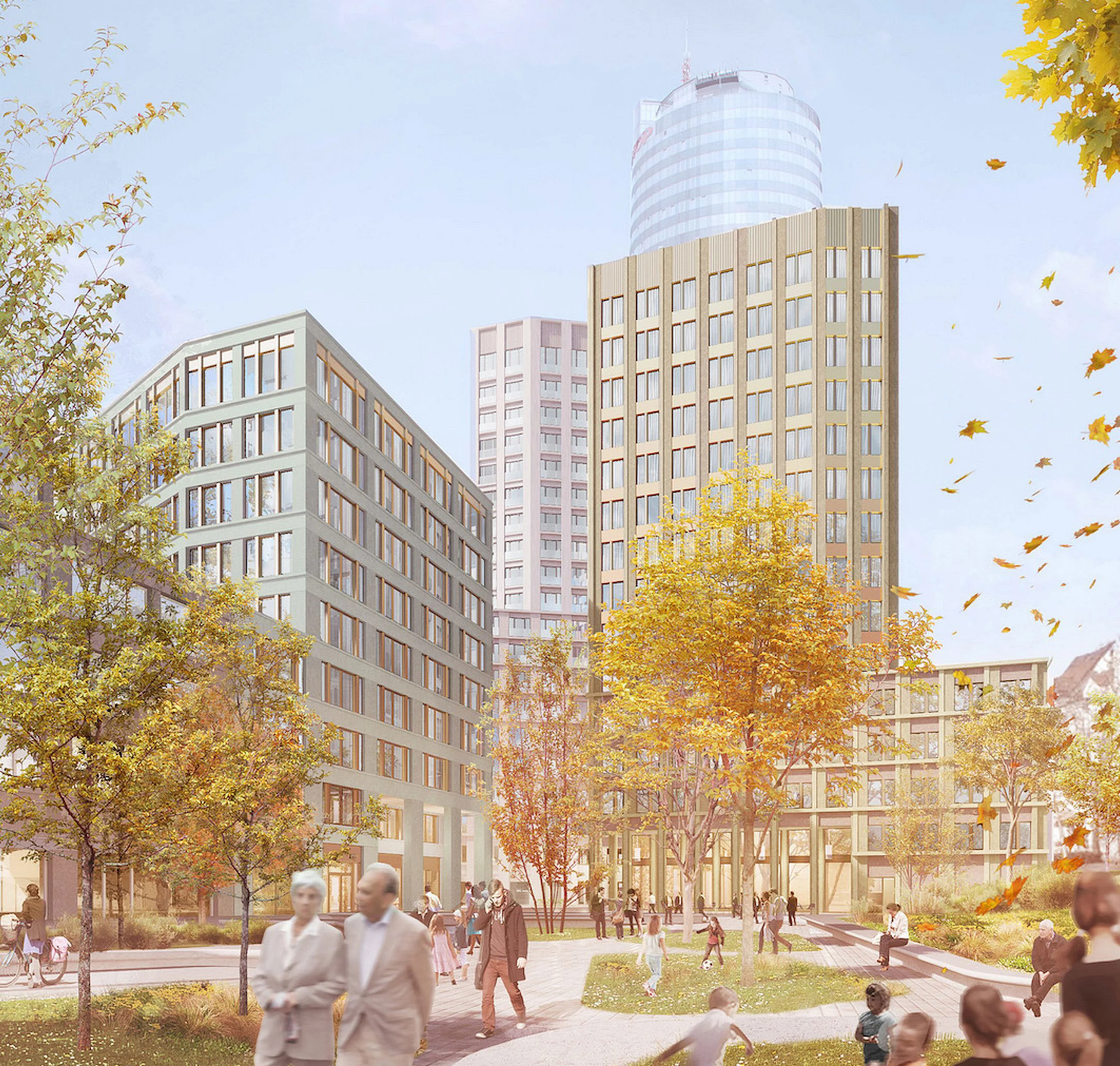 Three high-rise buildings with 20, 14 and ten floors are expected to be erected one after the other on almost 3,580 m² of the Eichplatz. All in all, around 148 apartments and 7,700 m² of office space are being built in this area of the Eichplatz. Retail and culinary offerings on the ground floor improve the area's amenity value.
