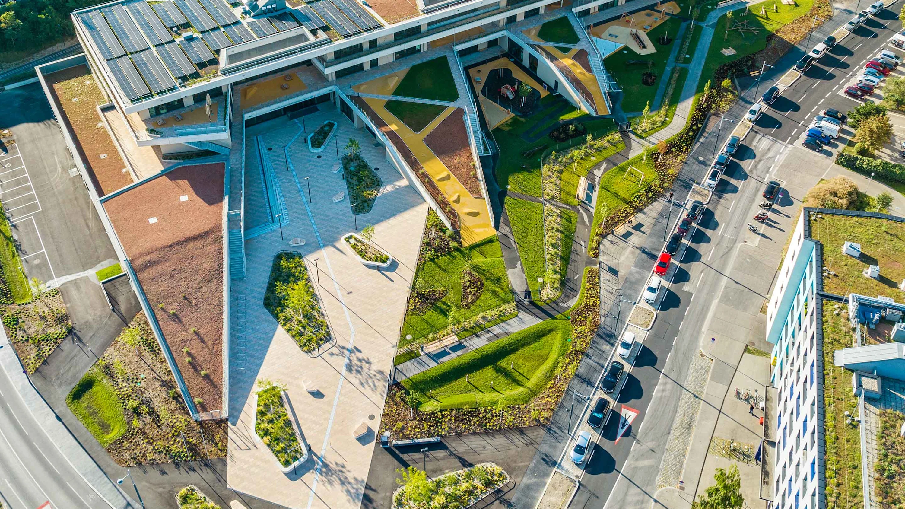 10.500 m² Außenanlagen, wie Bewegungs-, Spiel-, Ruhe- und Lernbereiche, ein Multifunktionspark und ein Sportplatz stehen den Kindern und Jugendlichen zum Spielen und Verweilen zur Verfügung.