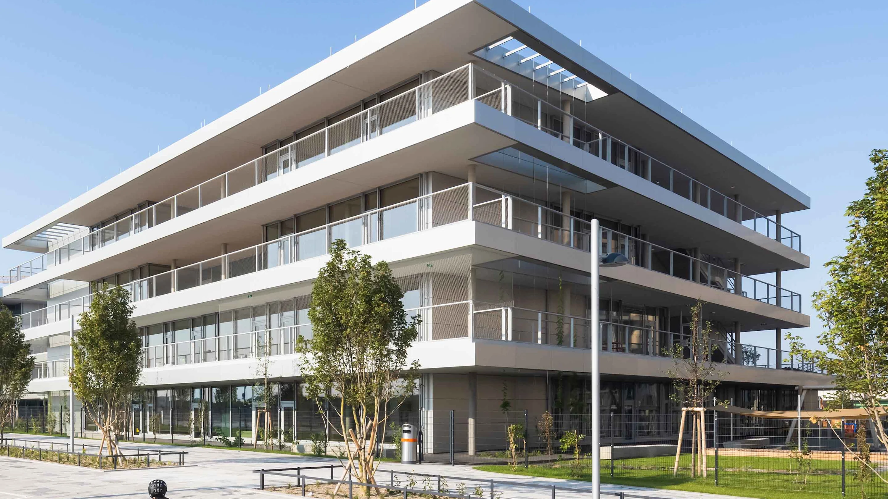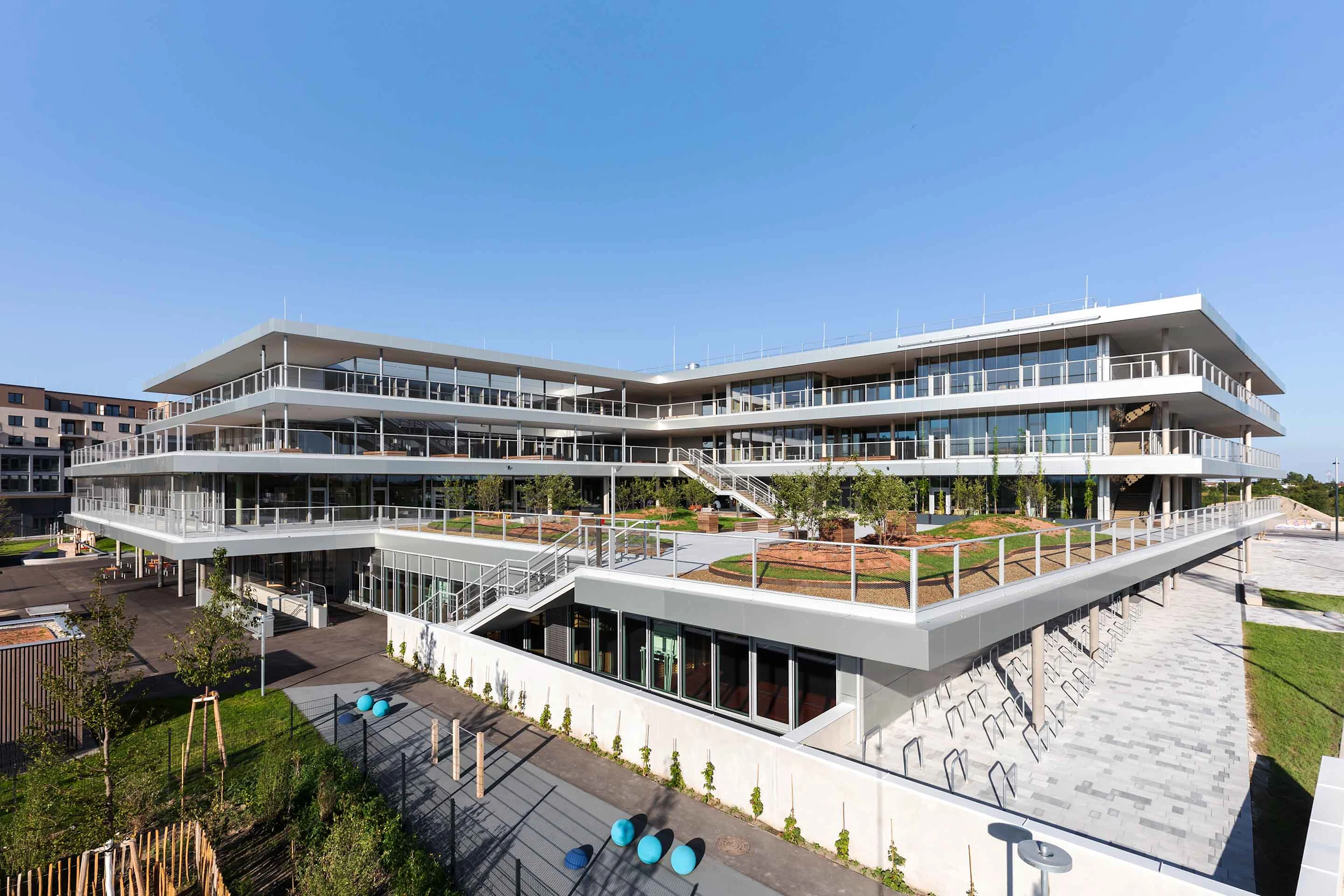 Der Gebäudekomplex ist in drei Baukörper aufgeteilt, die im Außenbereich durch ein gut zugängliches Angebot an Freiflächen und -klassen miteinander verbunden sind. Umlaufende Balkone und Terrassen mit teilweiser Fassadenbegrünung und Freitreppen in den weitläufigen Garten bieten eine hohe Aufenthaltsqualität für Lehrende und Lernende.