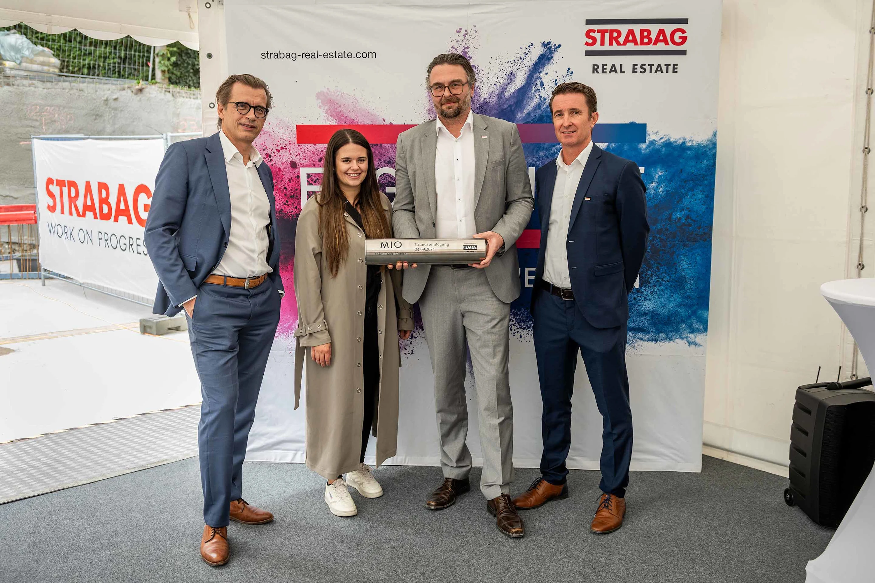 Gruppenfoto: v.l.n.r.: Erwin Gröss (STRABAG Real Estate Geschäftsführer Österreich), Gemeinderätin Julia Carina Payer, Lukas Kujawa (STRABAG Real Estate Bereichsleiter Wohnbau) und Markus Pfeifer (Technischer Direktionsleiter STRABAG AG) präsentieren die Zeitkapsel, die mit dem Grundstein verbaut wurde.