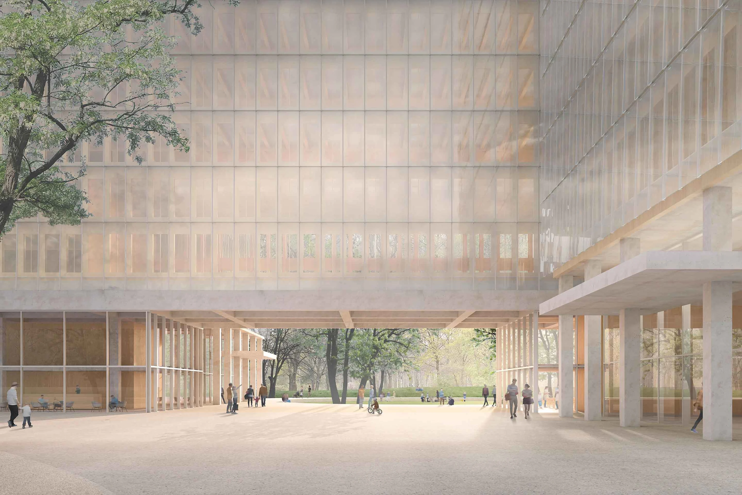 Eine Besonderheit, der Komplex ist als Holz-Hybridbau geplant. Das heißt, die Stützen sind nicht nur aus Beton, sondern teilweise aus Holz. Grundrisse können damit maximal flexibel und durchlässig für Tageslicht gestaltet werden und Holz sorgt für ein gutes Raumklima.