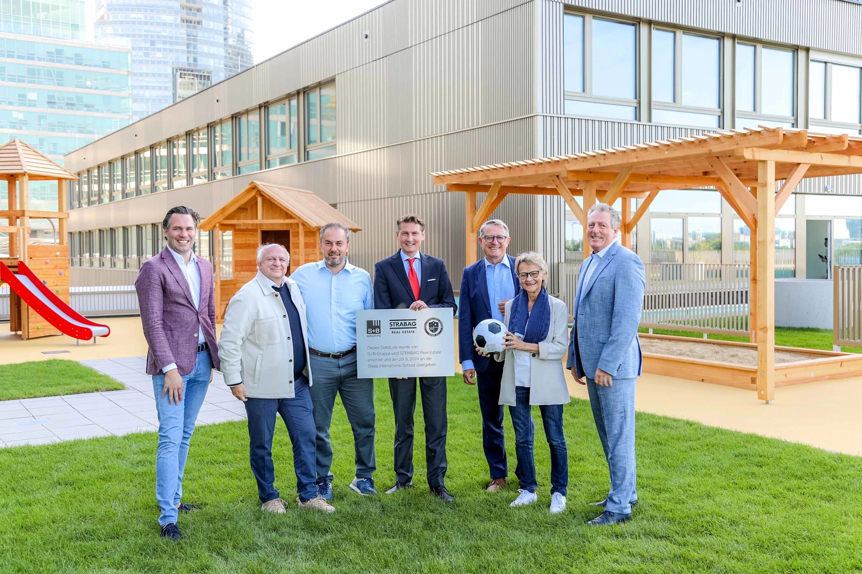 v.l.n.r.: Oliver Zaininger (Vorstand S+G Gruppe), Wolfdieter Jarisch (Vorstand S+B Gruppe), Erol Milo (STRABAG Real Estate Bereichsleiter Gewerbe), Matthias Gass (Stella International School), Martin Kapoun (Bildungsdirektion Wien), Heidi Burkhart (Vorstandsvorsitzende Stella International School), Christian Kerth (STRABAG Real Estate Gruppenleiter Gewerbe)