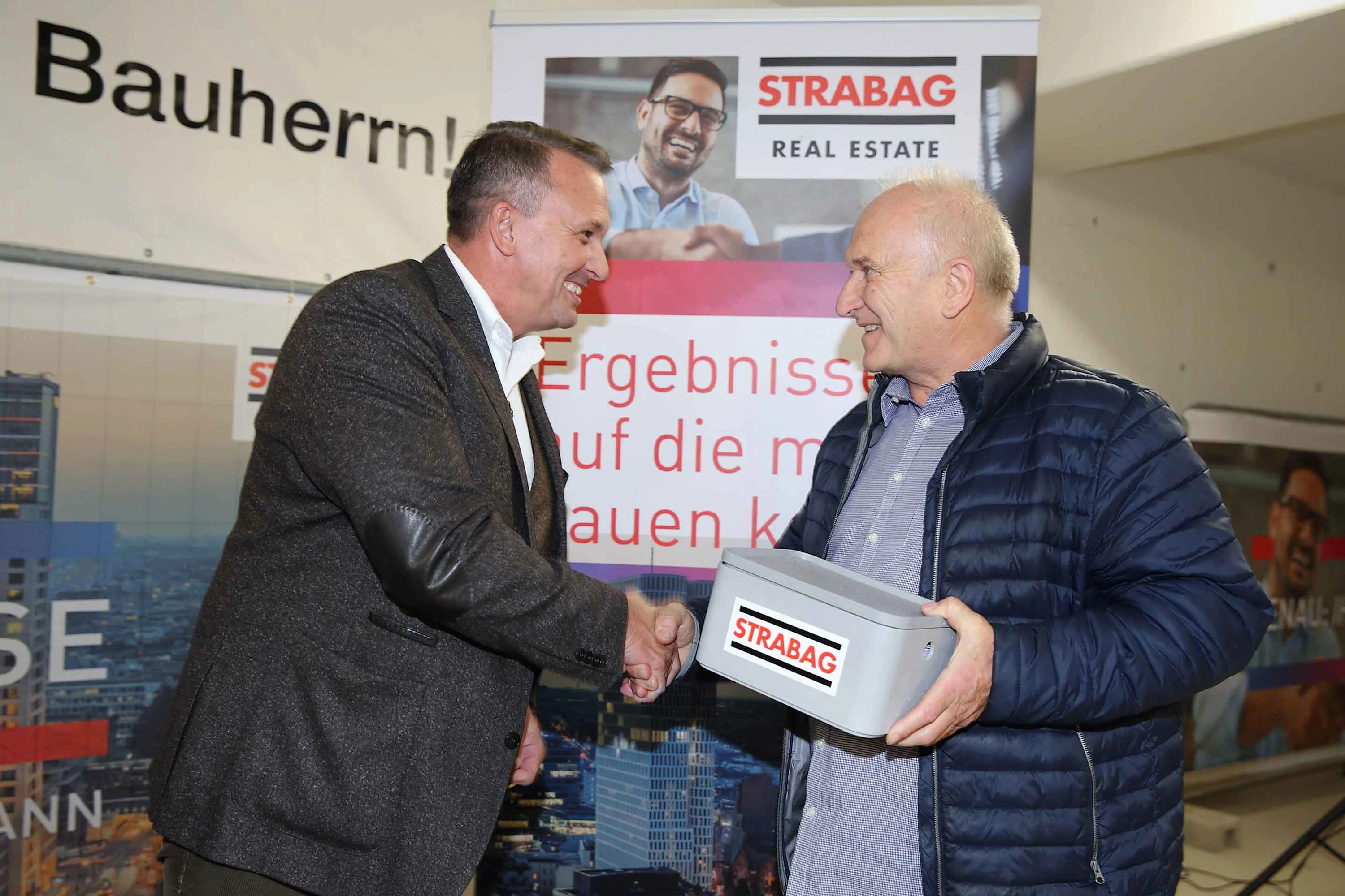 Reinhard Hoch (STRABAG Real Estate Projektleiter) übergibt das Gleichengeld an Erich Reiss (STRABAG Hochbau)