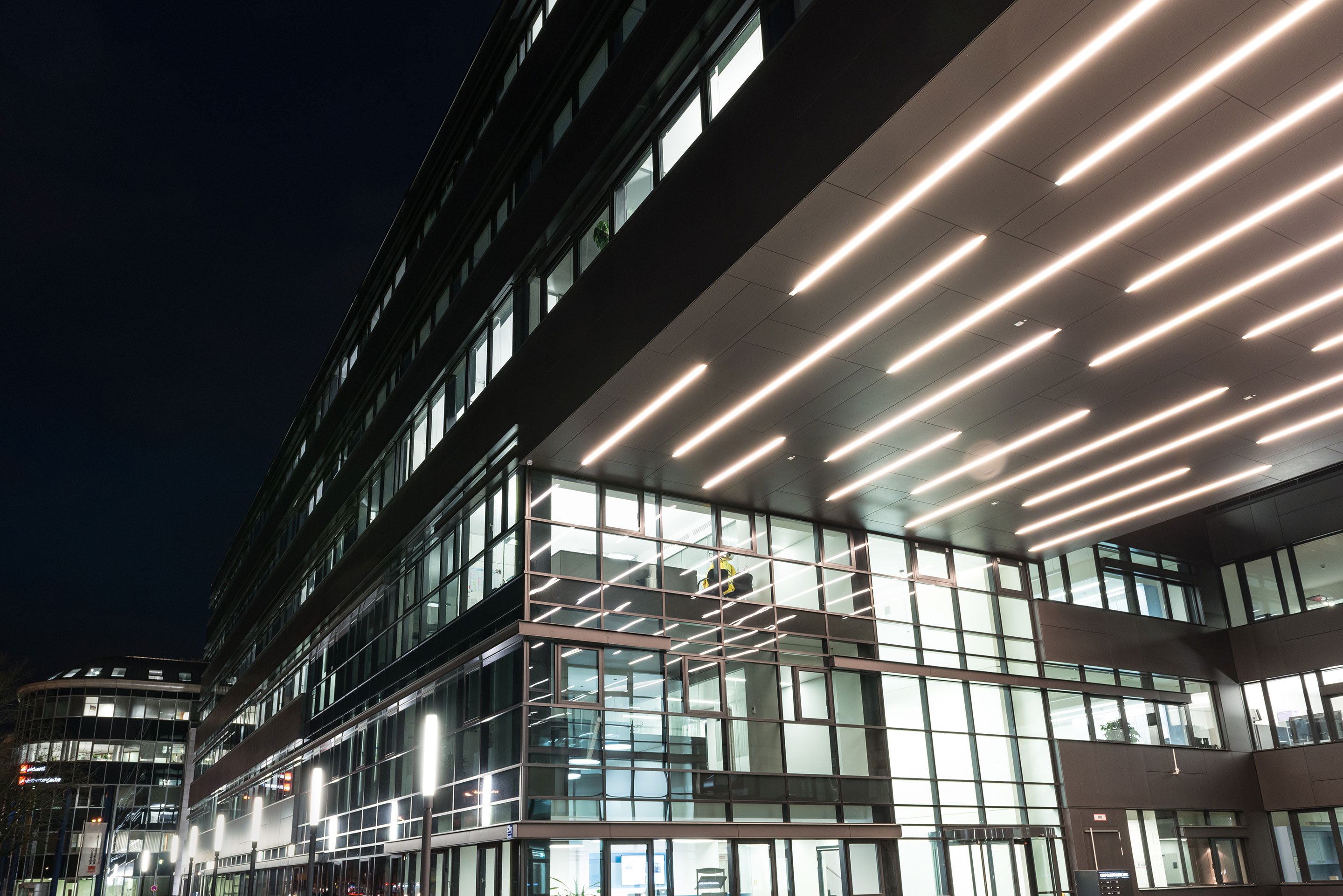 Thermoaktive Betondecken zur Kühlung, lichte drei Meter hohe Büroräume, automatisierte Belüftung