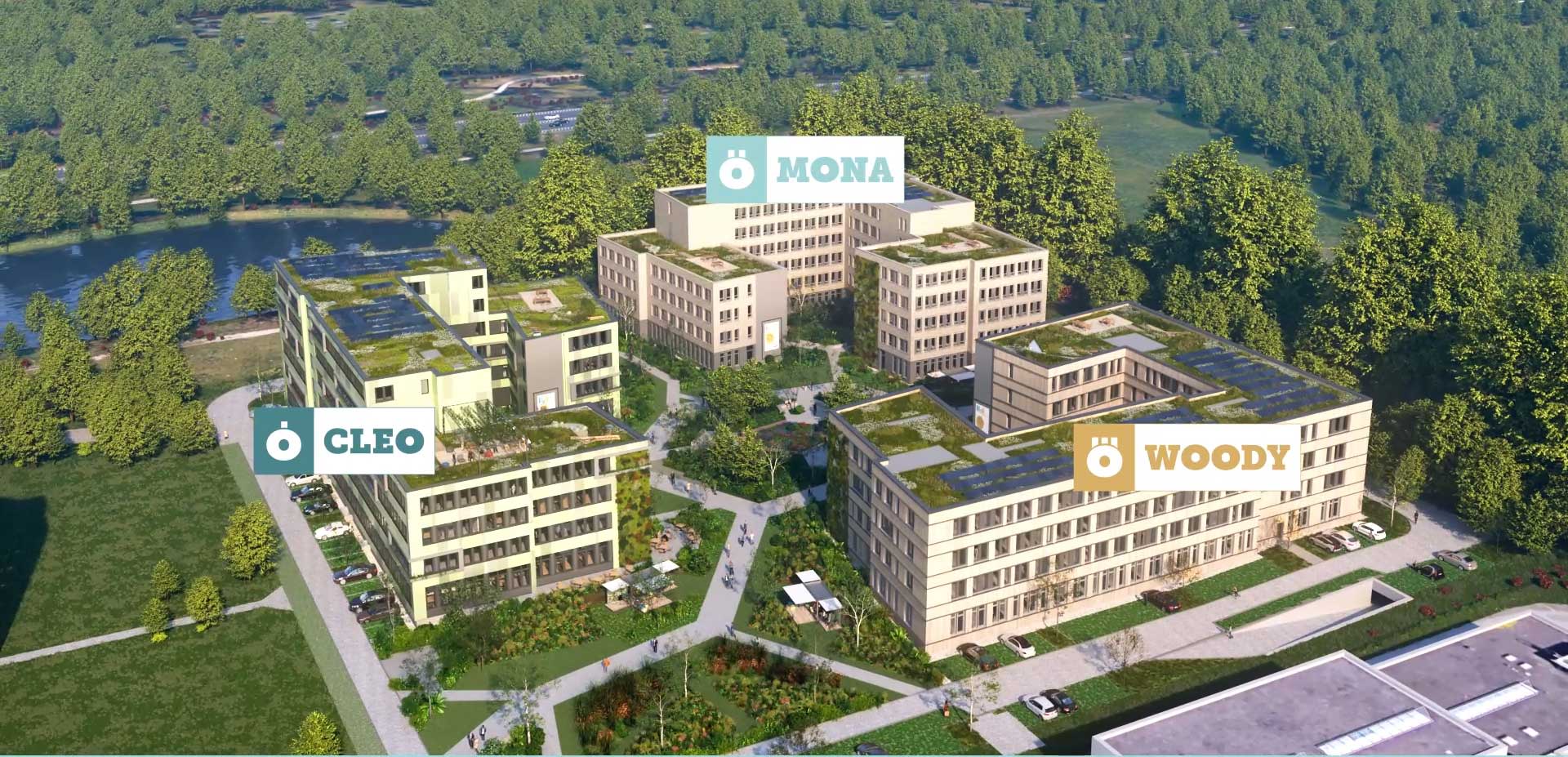WOODY, die Hölzerne, hat eine Fassade, die fast vollständig aus Holz gebaut ist. Im Inneren wird die Luftfeuchtigkeit durch das Holz reguliert. Das Gebäude hat einen deutlich niedrigeren CO2-Fußabdruck als herkömmliche Bauten.
