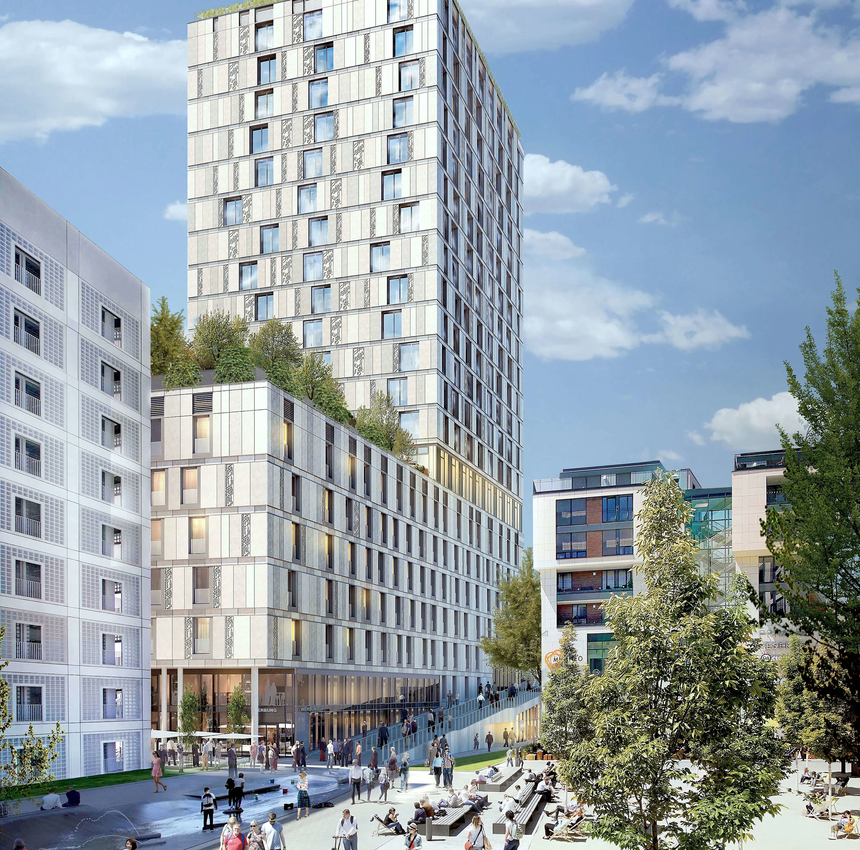 Ganz auf Gastlichkeit ist der Turm am Mailänder Platz (TMP) eingestellt. 66 Meter hoch ragt das Gebäude als dritthöchstes im bahnhofsnahen Europaviertel hervor. Die 14 Turmetagen bespielt Adina Apartment, den siebengeschossigen Sockelbau die Hotelkette Premier Inn. Üppig bepflanzte Dachgärten und kunstvolle Fassadenfresken verleihen dem Domizil auf Zeit seine unverwechselbare Identität. Café- und Kulinarik-Angebote machen den Turm zur Ausgehdestination, Shops und ein Spa runden den Komfort ab.
