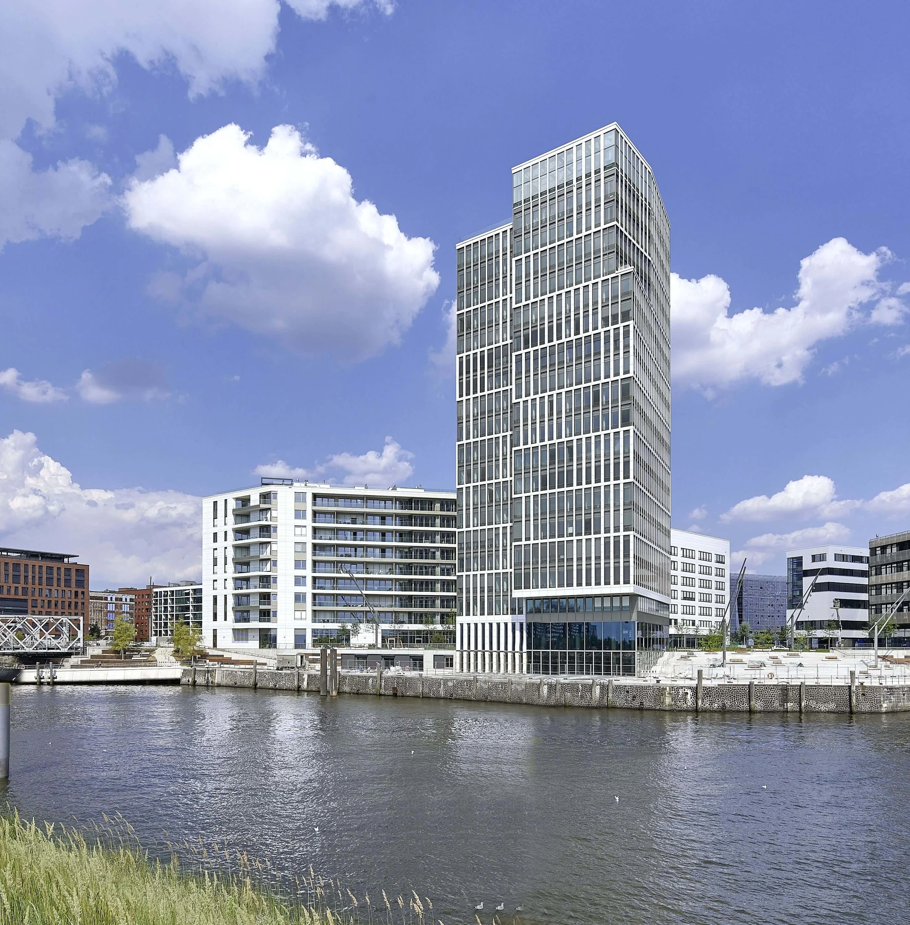 „Elegantes Ausrufezeichen in Weiß“ wird das 2018 fertiggestellte WATERMARK auch in Hamburg genannt. Der 18-geschossige Solitär überragt bislang alle Büros der HafenCity. Seine Größe macht ihn zum Blickfang, aber auch die exponierte Elb-Lage und die wertig schimmernde Porzellan-Fassade. Der Hochpunkt ist Teil des Gebäudetrios „Intelligent Quarters“ (IQ). Das im Joint-Venture mit ECE realisierte Quartier besteht aus einem Wohn- und zwei Bürohäusern mit belebenden Nutzungen im Erdgeschoss. Alles in allem entstanden ca. 32.000 m² Fläche in direkter Nachbarschaft zur HafenCity Universität.