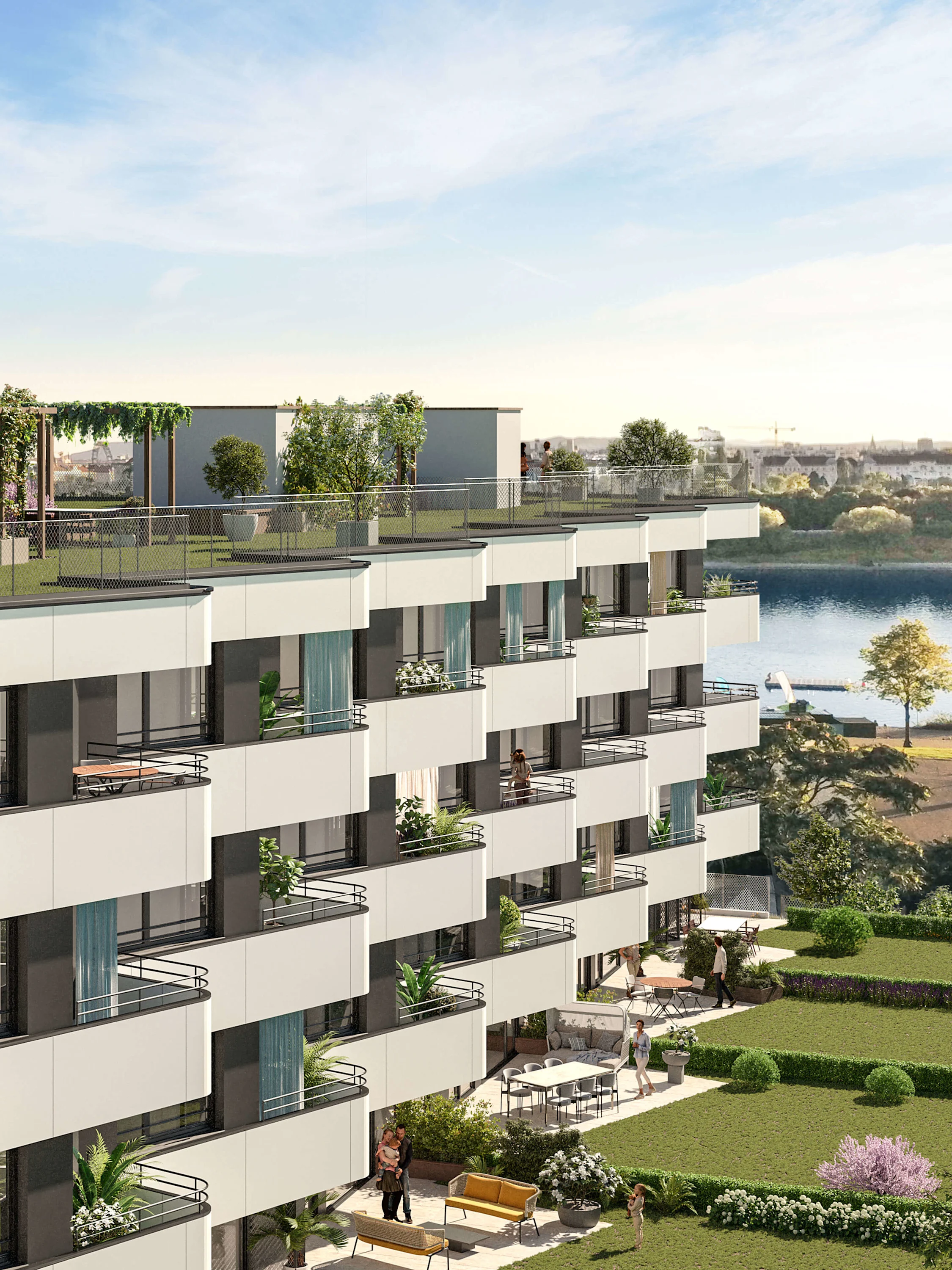 View of the new Danube, spacious roof terraces for apartments on the third floor, directly at the recreation areas of Danube Island and the Donaupark.