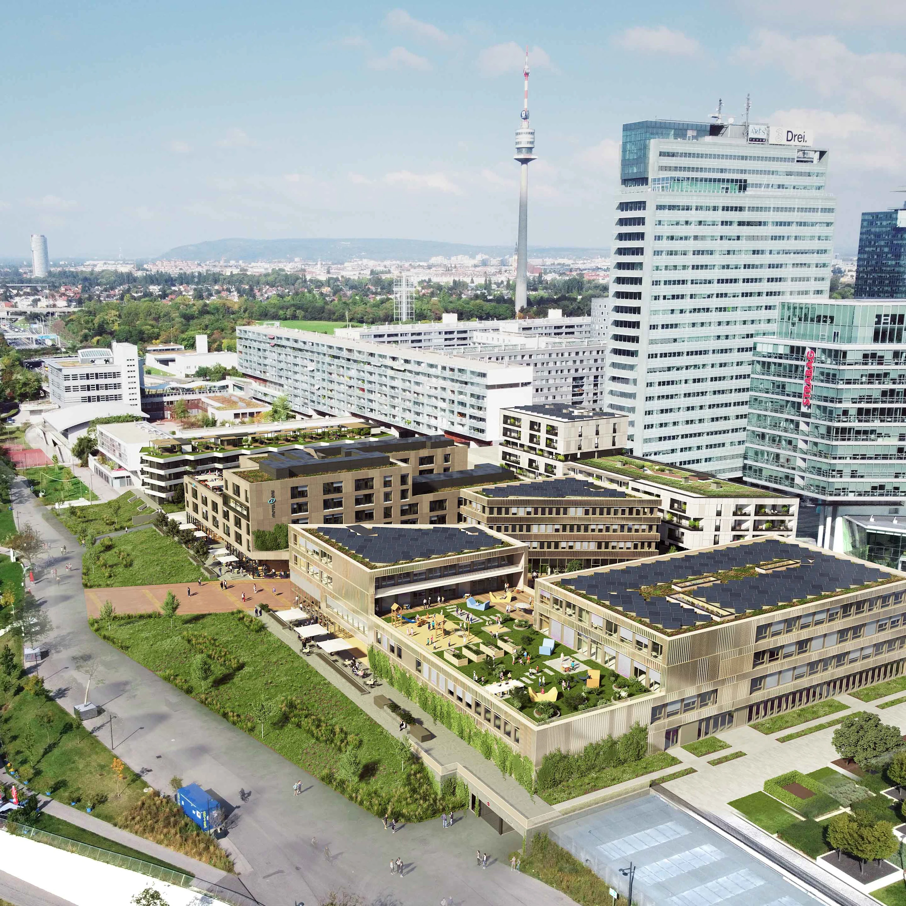 The modern and multi-functional office complex is a pioneer among sustainable office properties. This creates added value for people and nature, which has been recognised with a platinum certification from the Austrian Society for Sustainable Real Estate Management. The building was designed by the renowned HNP architects. The result: More space, flexible and adjustable office spaces and practical considerations taking into account the needs of future users. This kind of considered approach has resulted in the area becoming a modern hub for media, communications and life sciences.