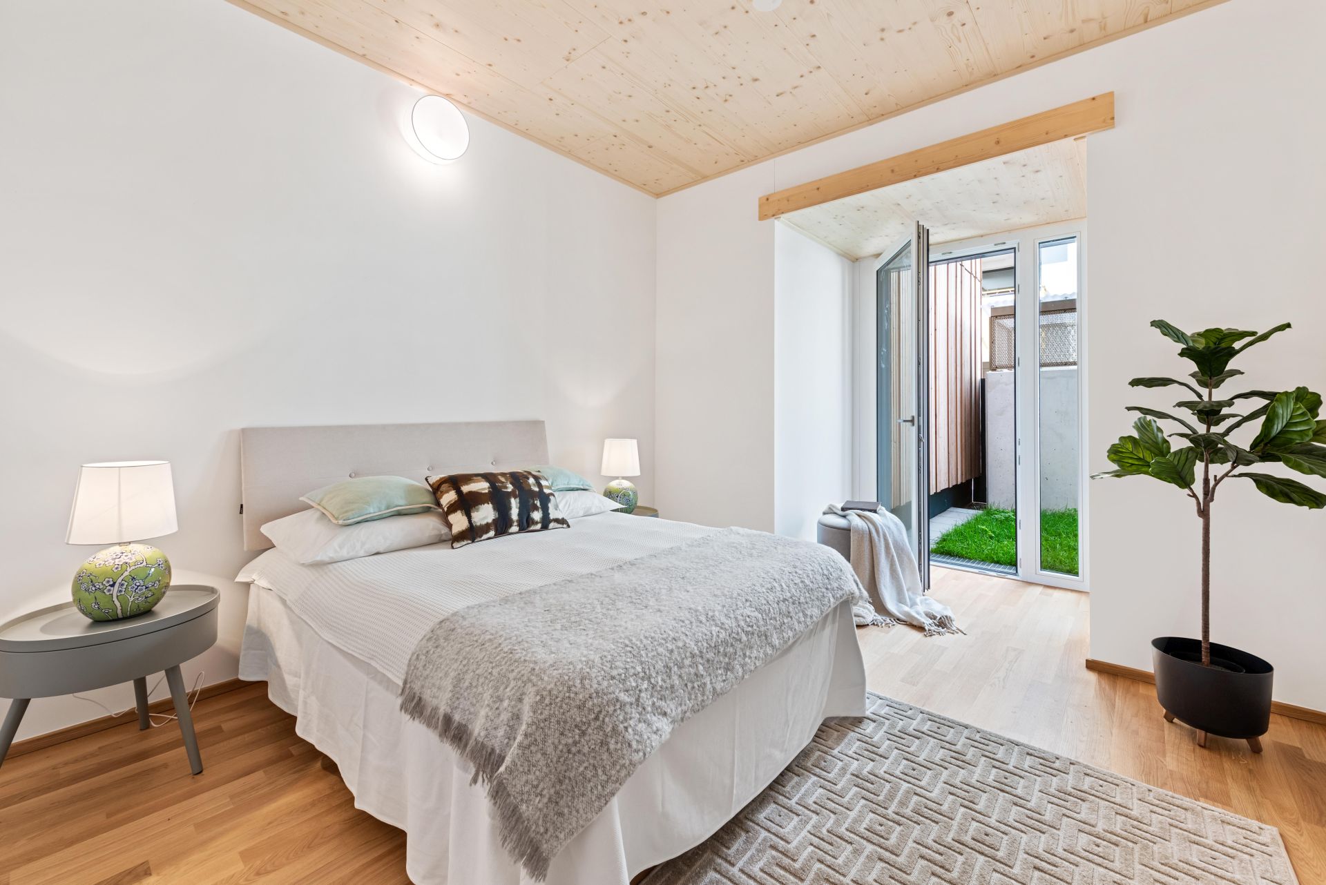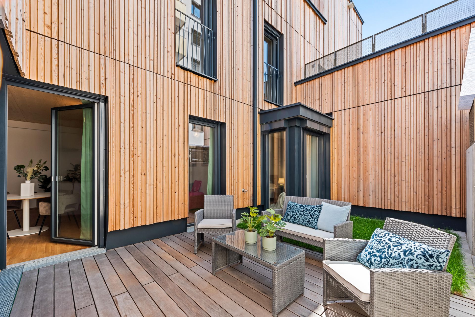 two patio houses in a wood hybrid construction